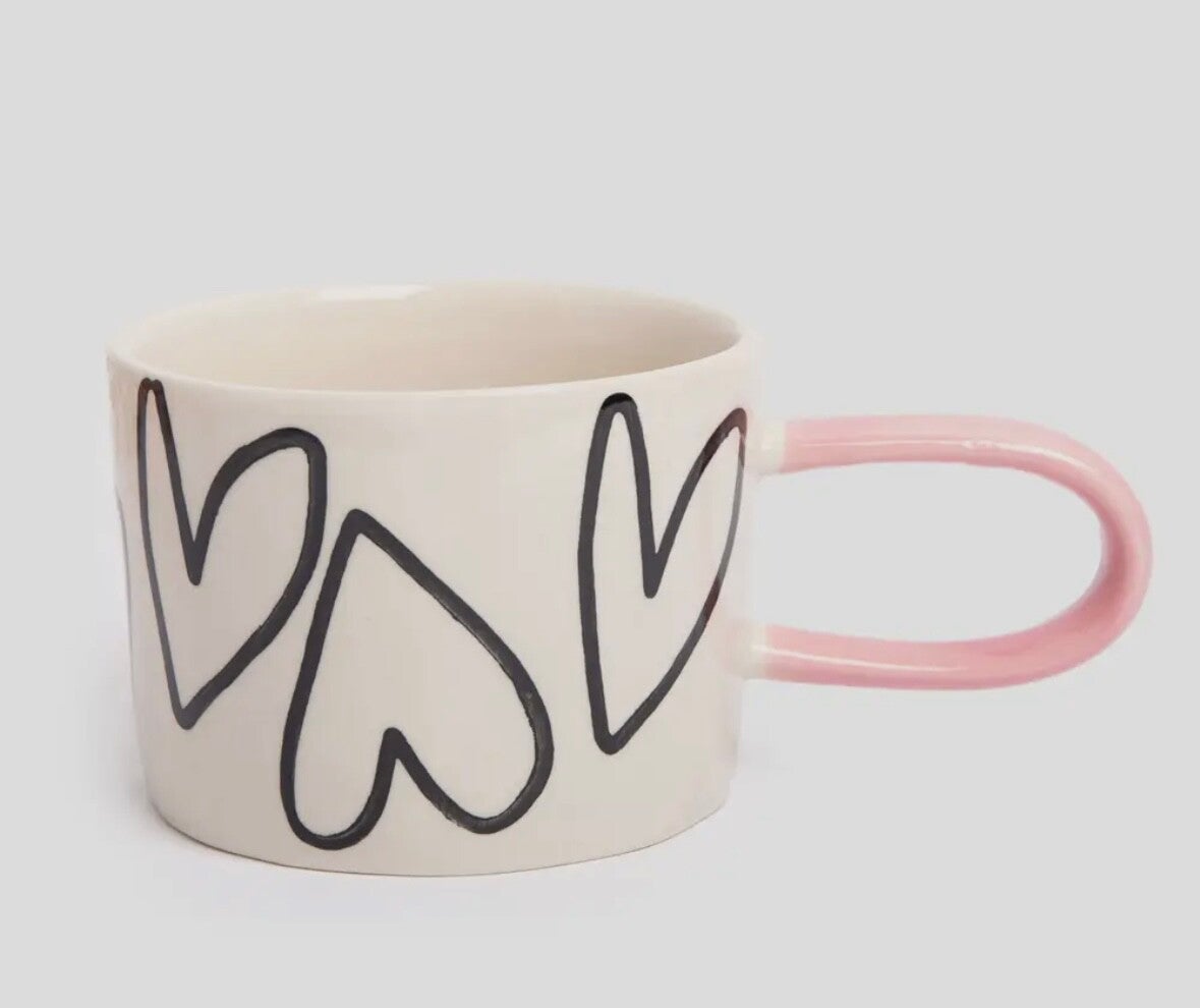 Our monochrome hearts hand painted glazed stoneware mug will add a pop of personality and fun to your kitchen. Purchased individually or as a set, our mugs feature bold prints and contrast colour elongated handle.