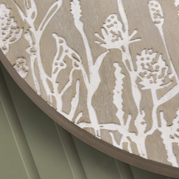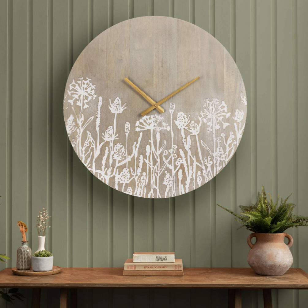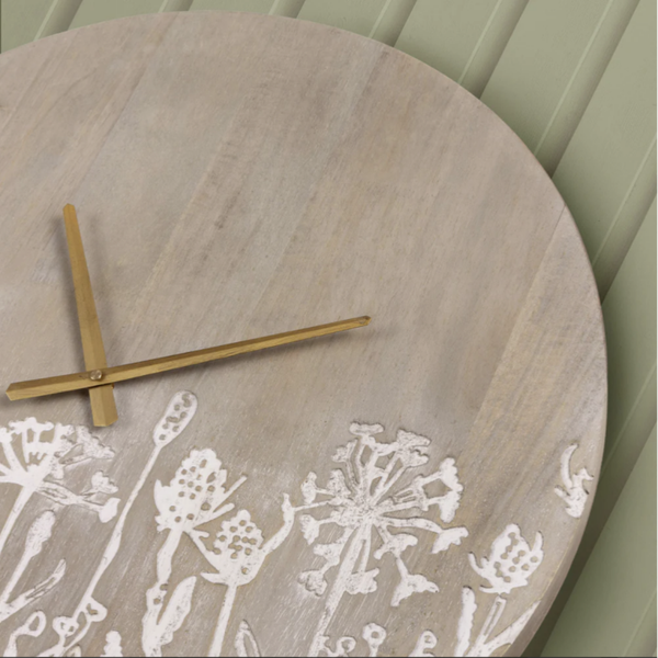 The Fleur Et Faune Clock blends functionality with artistic elegance. Featuring an intricately detailed wildflower design arranged along its base, the clock captures the essence of tranquillity and natural beauty. Its circular shape, paired with a neutral colour palette and wooden finish, seamlessly integrates into diverse decor styles, from rustic to contemporary. Sleek black clock hands provide clear readability, complementing the soft tones of the wooden face for a harmonious look. This timepiece serves both as a practical tool and a decorative statement, embodying craftsmanship and timeless charm.