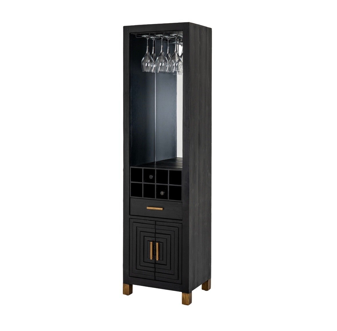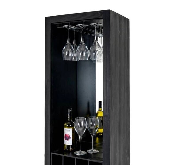 Featuring a sleek wine rack and glass holder a double door cupboard and one drawer