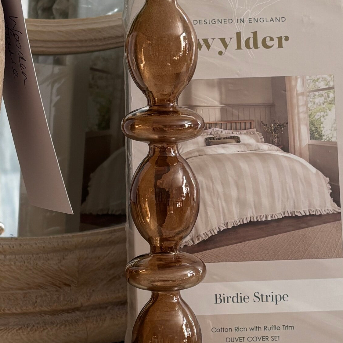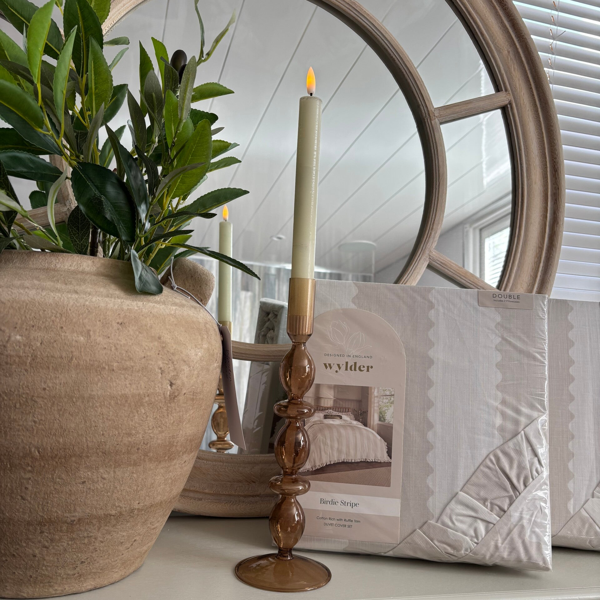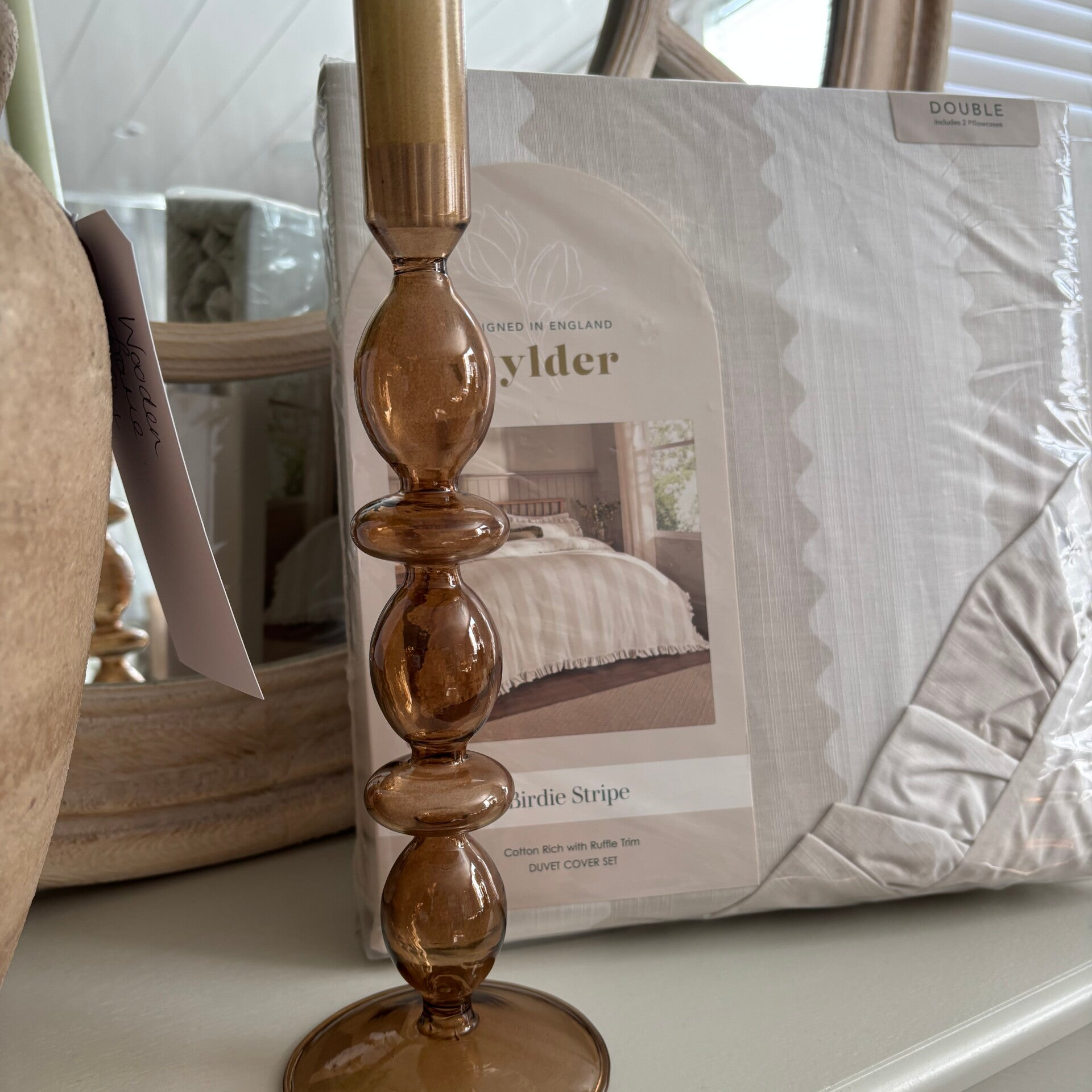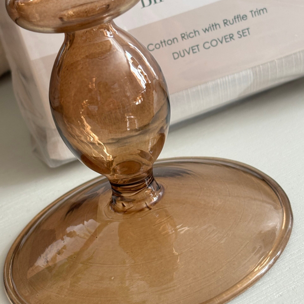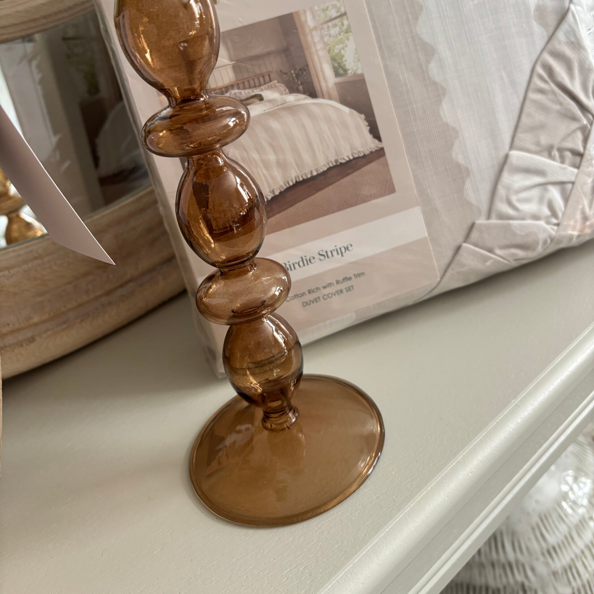 This beautiful candlestick is in a warm coffee colour, And has a unique bubble stem